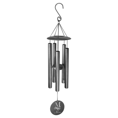 This black powder-coated aluminum wind chime features a 4" disc for the 30" and 5 1/4" for the 36" that can be laser engraved on both sides. Five 7/8" tubes range in length from 11 1/4" to 16" and produce a beautiful, rich tone in the slightest breeze. Wind chimes make a great gift for a housewarming or any occasion.